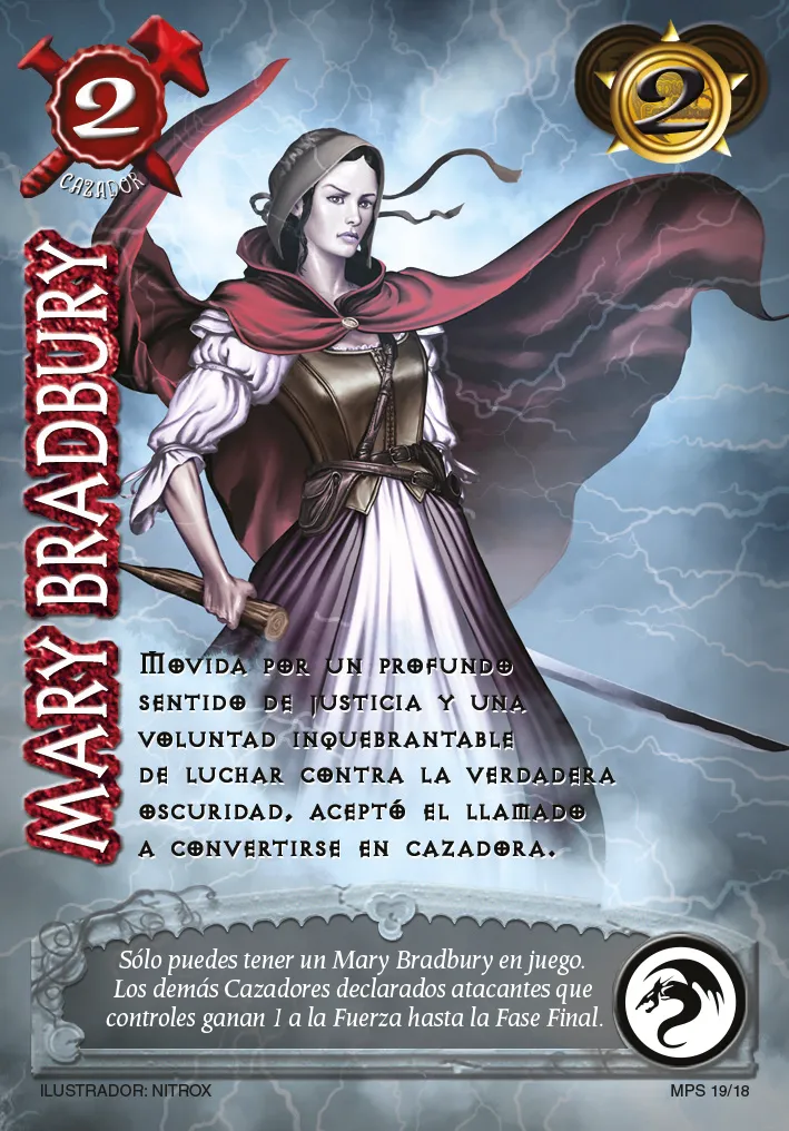 Habilidad: Solo puedes tener un Mary Bradbury en juego. Los demas Cazadores declarados atacantes que controles ganan 1 a la Fuerza hasta la Fase Final.