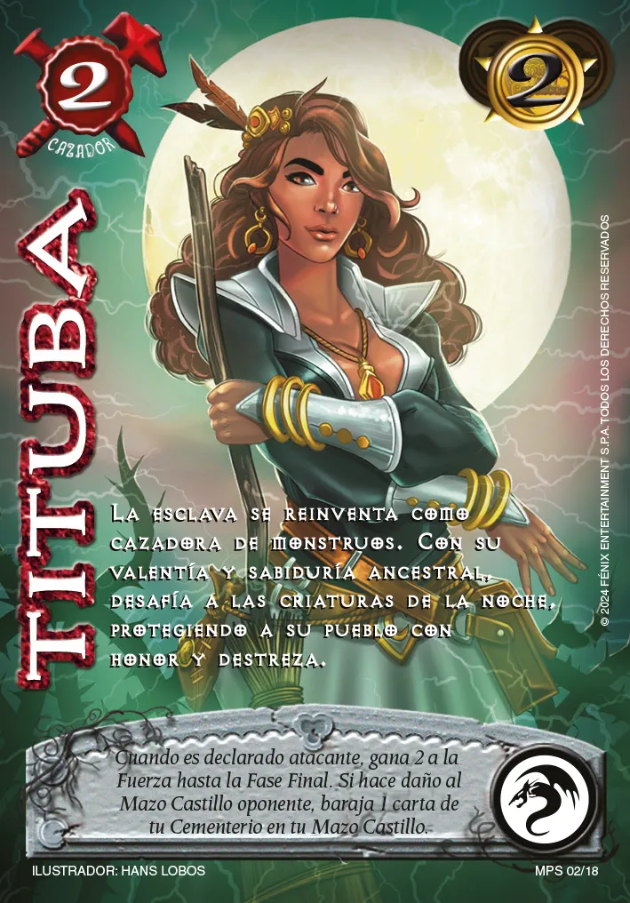 Habilidad: Ouando es declarado atacante, gana 2 a la Fuerza hasta la Fase Final. Si hace daño al Mazo Castillo oponente, baraja I carta de tu Cementerio en tu Mazo Castillo.: