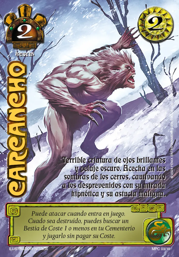 Habilidad: Puede atacar cuando entra en juego. Cuado sea destruido, puedes buscar un Bestia de Coste 1 o menos en tu Cementerio y jugarlo sin pagar su Coste.