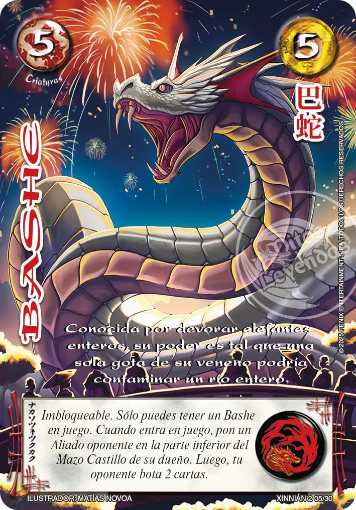 Habilidad: Imbloqueable. Solo puedes tener un Bashe en juego. Cuando entra en juego, pon un Aliado oponente en la parte inferior del Mazo Castillo de su dueño. Luego, tu oponente bota 2 cartas.