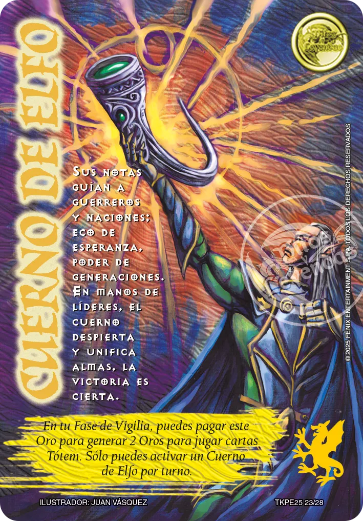 Habilidad: En tu Fase de Vigilia, puedes pagar este Oro para generar 2 Oros para jugar cartas, Tótem. Sólo puedes activar un Cuerno de Elfo por turno.