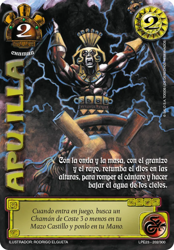 Habilidad: Cuando entra en juego, busca un Chaman de coste 3 o menos en tu Mazo Castillo y ponlo en tu Mano.