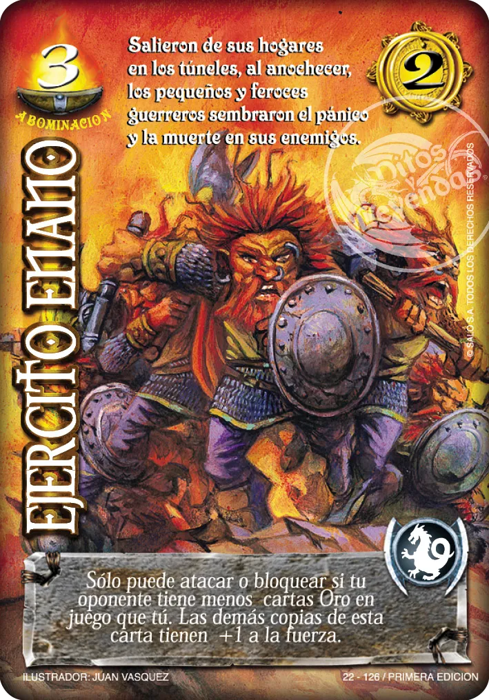 Habilidad: Gana 1 a la Fuerza por cada otro ejercito enano que controles. Si controlas mas oros que tu oponente, es imbloqueable.