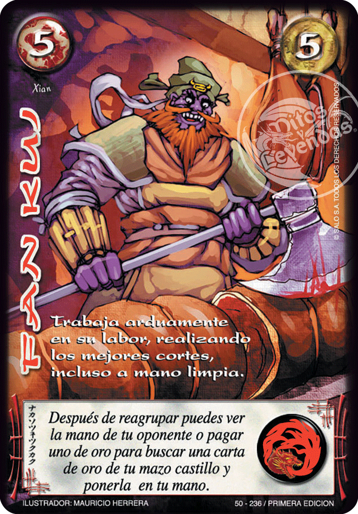 Habilidad: Puede atacar cuando entra en juego. En tu Fase de Vigilia, una vez por tumo, puedes desterrar 2 cartas de tu Cementerio para ver la Mano de tu oponente o para buscar un Oro en tu Mazo Castillo y ponerlo en tu Mano.