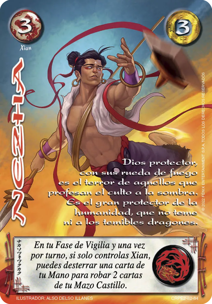 Habilidad: En tu Fase de Vigilia y una vez por turno, si solo controlas Xian, puedes desterrar una carta de tu Mano para robar 2 cartas de tu Mazo Castillo.