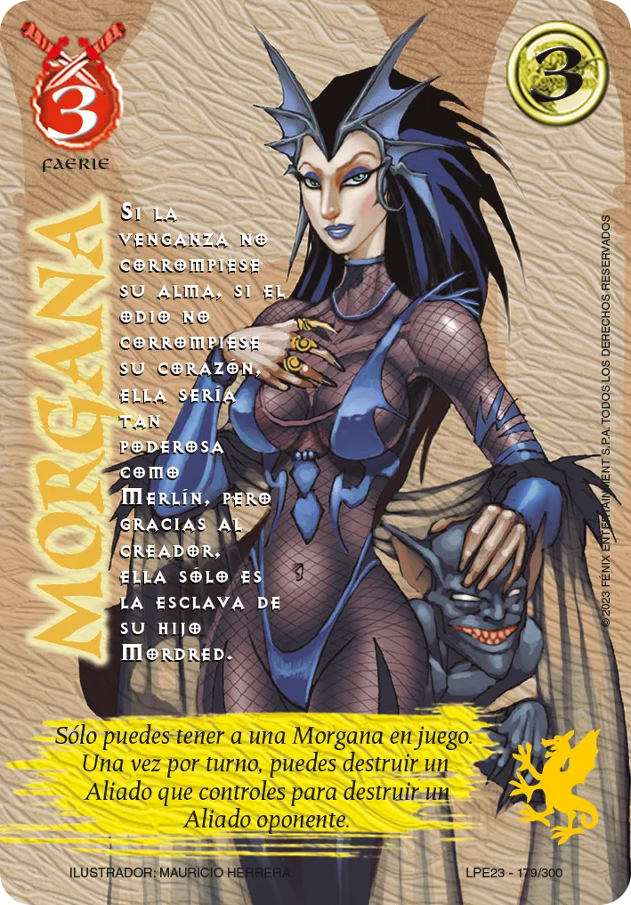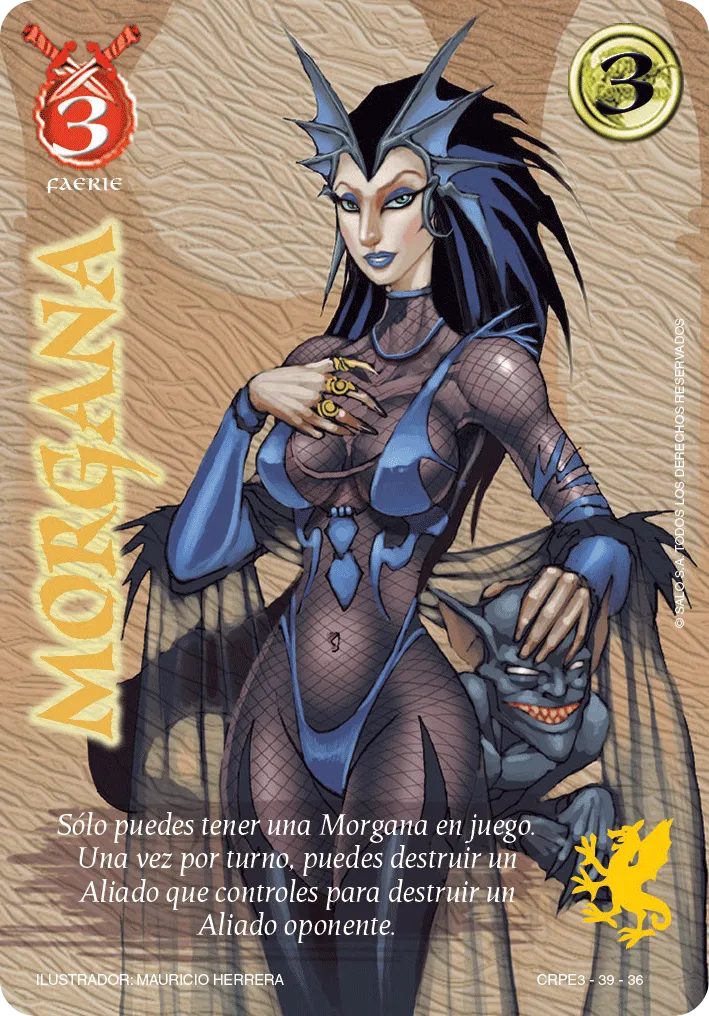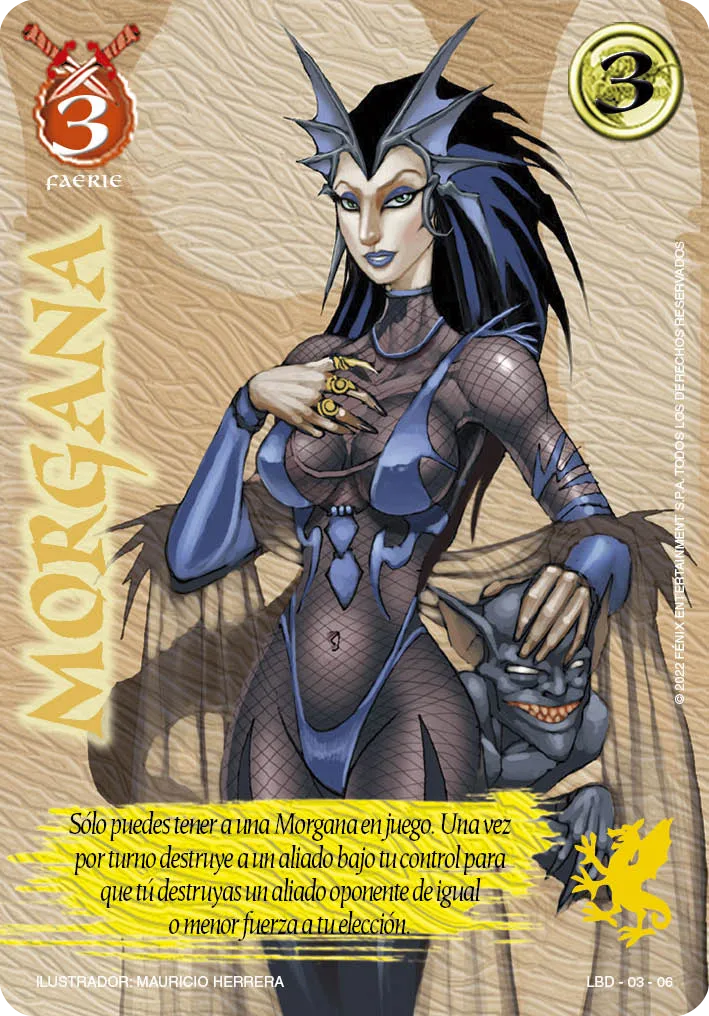 Habilidad: Solo puedes tener una Morgana en juego. Una vez por turno, puedes destruir un Aliado que controles para destruir un Aliado oponente.