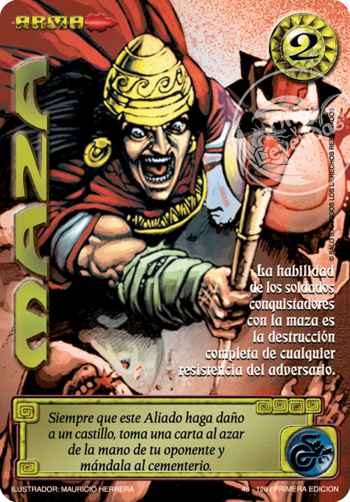 Habilidad: Cada vez que el portador haga Daño de Combate al Mazo Castillo oponente, tu oponente descarta 1 carta al azar de su Mano.
