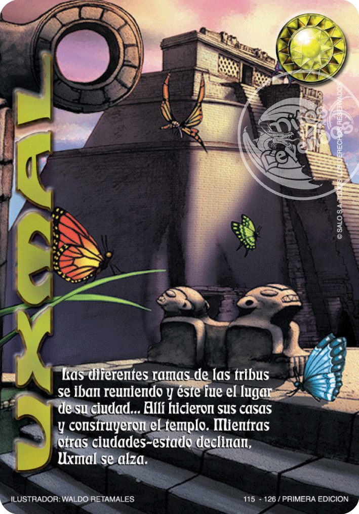 Habilidad: Cuando entra en juego, puedes buscar un Totem en tu Mazo Castillo que no sea Uxmal y ponerlo en tu Mano. Cada vez que otro Totem entre en juego bajo tu control, tu oponente bota 1 carta.