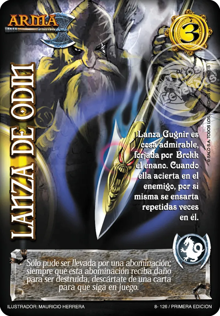 Habilidad: El portador gana 2 a la fuerza. Puedes descartar una carta de tu Mano, para prevenir que el portador sea destruido.