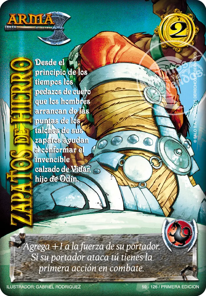 Habilidad: El portador gana 2 a la Fuerza. Cuando el portador es declarado atacante puedes elegir un Aliado en juego para que tenga Fuerza 0 hasta la Fase Final.