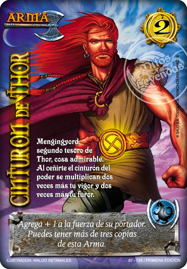 Habilidad: El portador gana 1 a la Fuerza. Cuando entra en juego, busca un arma en tu Mazo castillo y ponla en tu Mano. Puedes tener mas de 3 copias de esta carta.