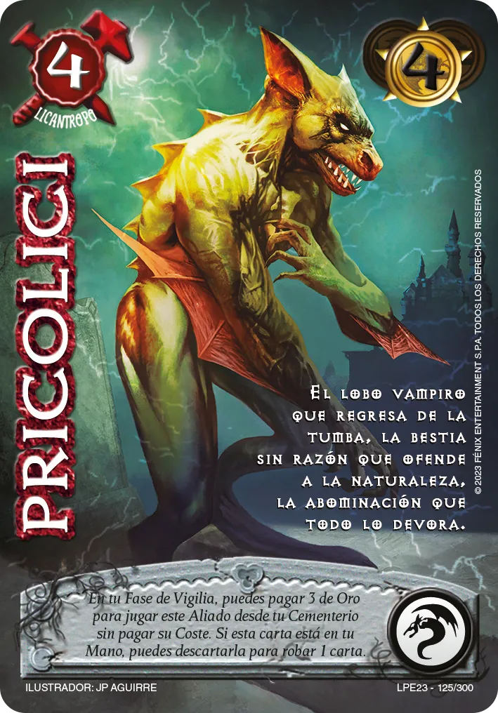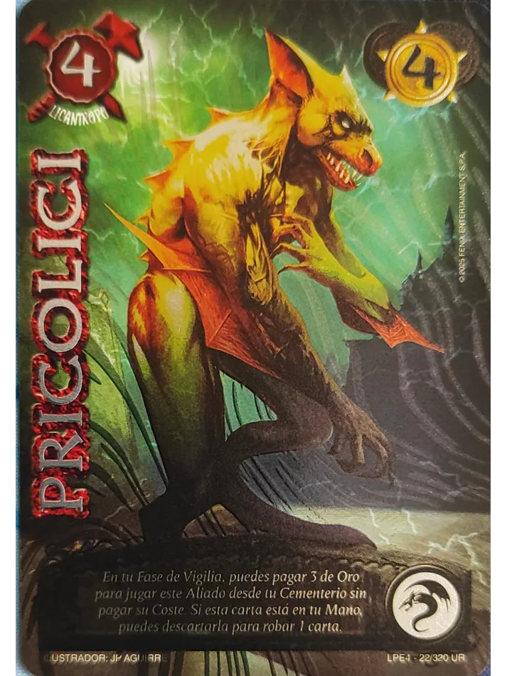 Habilidad: En tu Fase de Vigilia, puedes pagar 3 de Oro para jugar este Aliado desde tu Cementerio sin pagar su Coste. Si esta carta esta en tu Mano, puedes descartarla para robar 1 carta.
