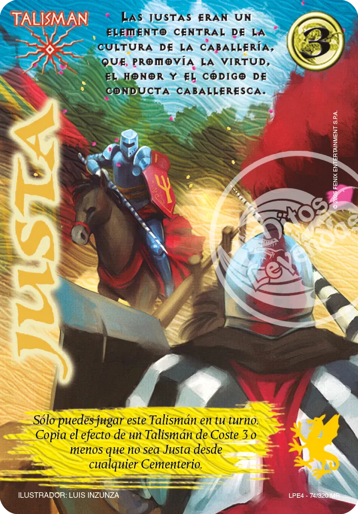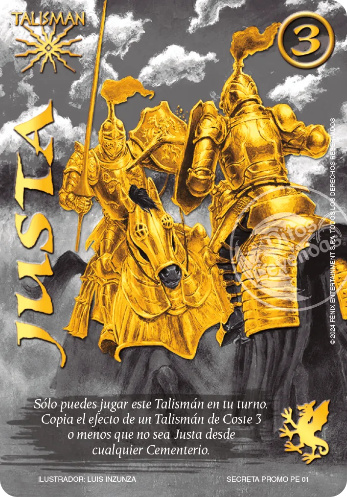 Habilidad: Solo puedes jugar este Talisman en tu turno. Copia el efecto de un Talisman de Coste 3. o menos que no sea Justa desde cualquier Cementerio.