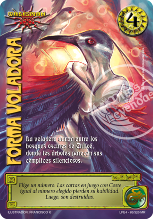 Habilidad: Elije un numero. Las cartas en juego con Coste igual al numero elegido pierden su habilidad y son destruidas.